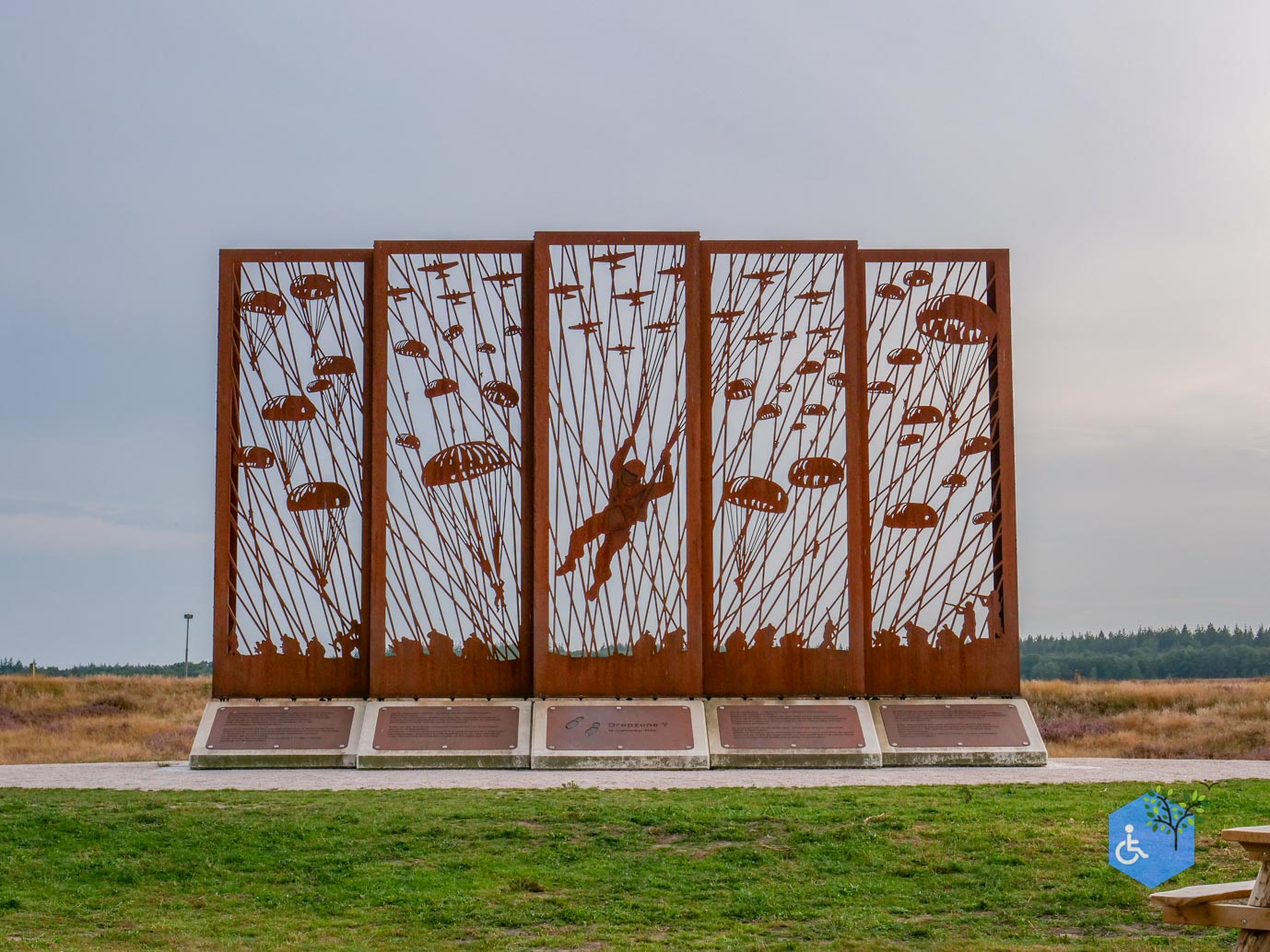 Op het parkeerterrein zijn twee invalidenparkeerplaatsen te vinden. Vanaf het parkeerterrein kom je een wildrooster tegen waar nog een hek naast geplaatst gaat worden. Momenteel is het wildrooster te vermijden door het pad naast het restaurant te nemen. Aan het einde van het vlonderpad is een groot (hoog) klaphek. Dit hek is zwaar, daarom raden we aan om een begeleider mee te nemen. Het laatste deel van onze route, het stuk aan de andere kant van de provinciale weg, is optioneel. Wel is dit stuk aan te raden in verband met de diverse monumenten voor Operatie Market Garden die zich daar bevinden. Om daar te komen moet je wel de provinciale weg oversteken. De oversteek is in twee delen en zeer overzichtelijk.
